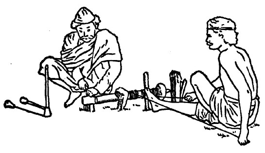 from Alphonso X's "Book of Games," Circa 1280 A.D. As with the Egyption stone carving it is believed that this was actually a horizontal set-up. There is no tool rest so the turner is steadying his tool between his toes. There are similar simple lathe that are operated in the same manner which can be seen in third world countries to this day.