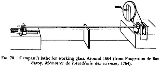In his La Dioptrique Oculaire (1671) Father Cherubin described various lathes he had adapted for glassworking. The operator stood at the left and pumped a stirrup hanging below the table which is attached to the overhead crank. An overhead bow works as a spring to assist the rotation of the crank on the up-swing. A series of pulleys on the shaft of the crank provided varying speeds.