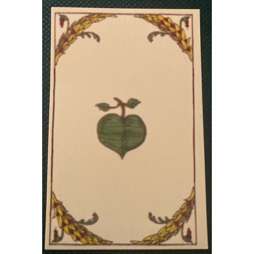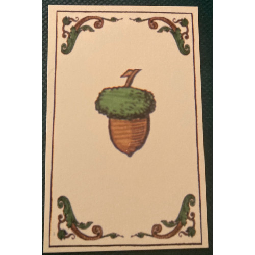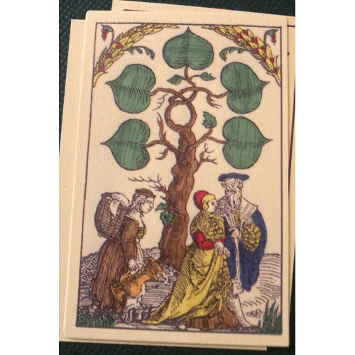Nicknamed the "poop deck" by some historical hobbyists, this is our own replica of a satirical deck of cards dating from 1545 and designed by the German artist Peter Flötner. (See the video below for a closer look a the deck). It used traditional German suits as well as "unter" and uber" figures rather than jacks and queens, and omits aces. 48-card decks were commonly used for a trick-taking game "Karnoffel." It was played mostly by the lower classes, and some naughty or satirical images on this deck reflect the game's lower class origins (the name Karnoffel itself translates as "hernia") It includes several satirical images such a monk vomiting, scenes of farting, spanking and "excreting". The back are blank as was most common for early playing cards. Includes an insert with the rules for the game Karnoffel. They are about 3.5 " x 2.25" the size of a modern "Bridge deck."